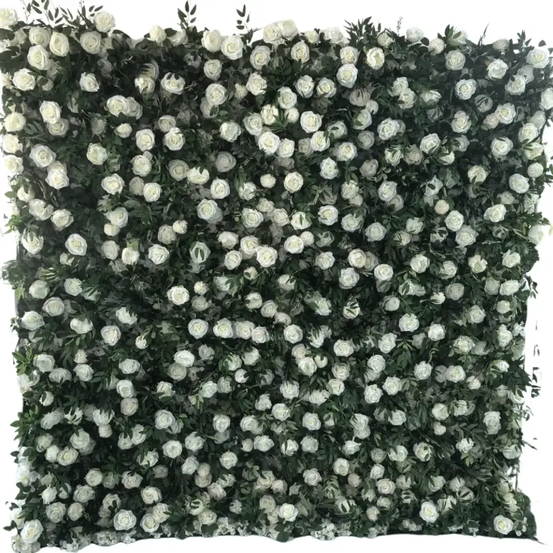 This flower wall is not only beautiful, but so easy to use! The convenient pocket makes it simple to slide the drape onto a crossbar and just like that you have a ready to use flower wall. Multiple layers of greenery and white roses give this flower wall added depth and a lush look and feel.